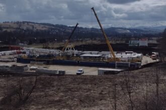 Wieża wiertnicza mierząca ok. 60 metrów wysokości stanęła w niedzielę w Szaflarach w pobliżu zabudowań pierwszej podhalańskiej geotermii…