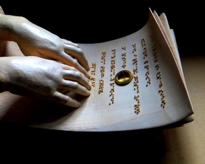 Po tych wstępnych pracach artysta mógł przystąpić do samego rzeźbienia… – Prace nad kopią dłoni trwały ponad miesiąc, w trakcie ich więcej czasu zajmowały mi jednak pomiary, niż samo rzeźbienie… Z kolei w sensie technicznym najtrudniejszą częścią zadania było wykonanie w drewnie wiernego zapisu fragmentu psalmu 126 za pomocą pisma Braille’a.